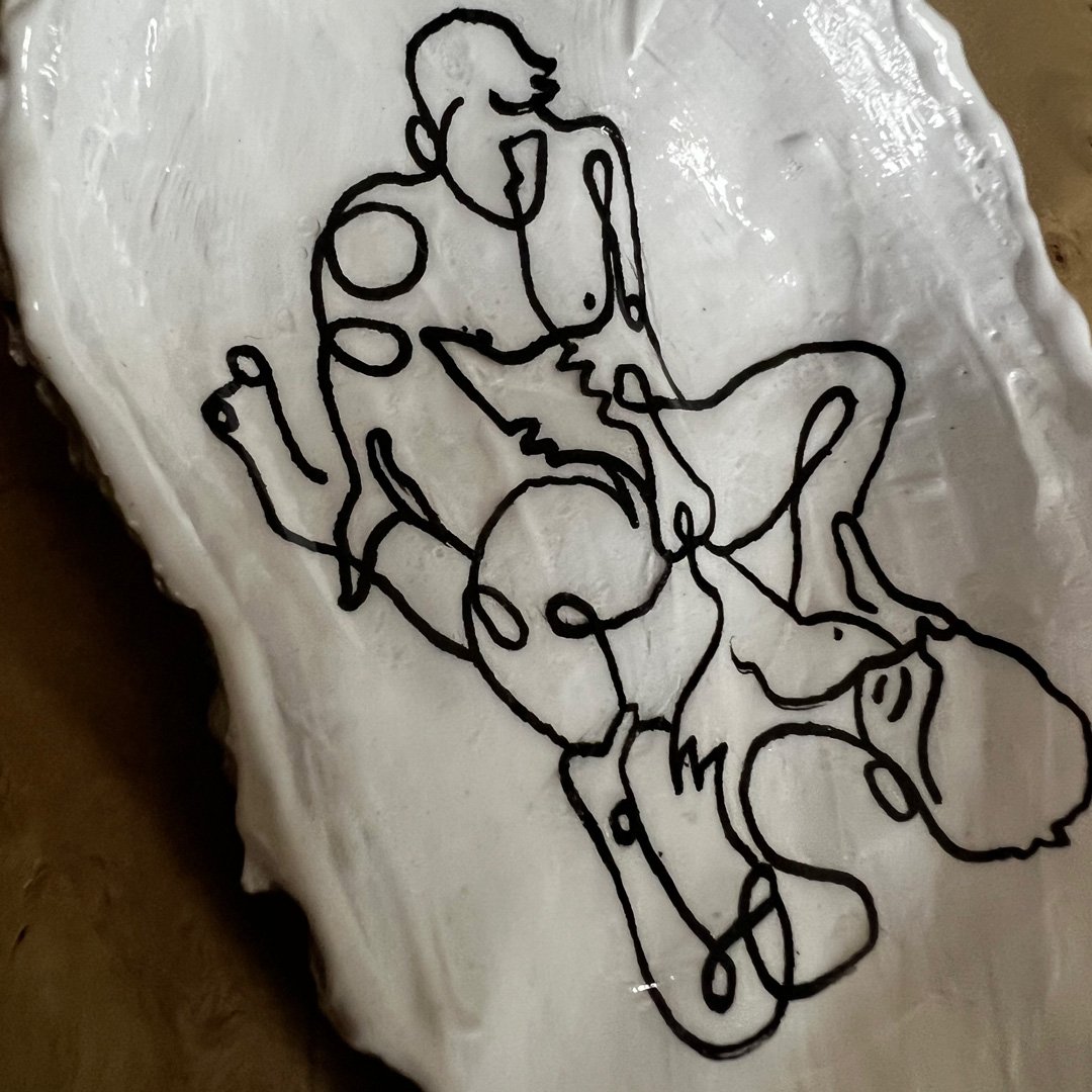 Boysters, a one-of-a-kind piece of oyster art lovingly drawn, painted, gilded, and assembled by hand. Each unique creation is inspired by the vibrant and diverse influences of Gay intimacy and love.